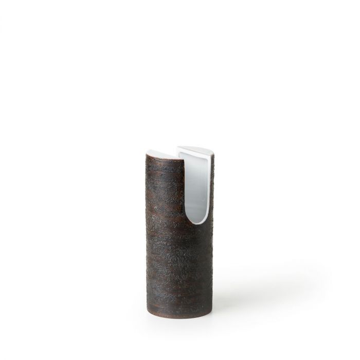 Hand-turned in red refractory clay with symmetrical cut in upper part. Glossy white glaze on the inside, brown on the outside.