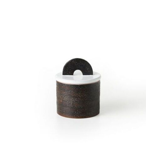 Hand-turned in red refractory clay with applications,with lid in glossy white glaze.