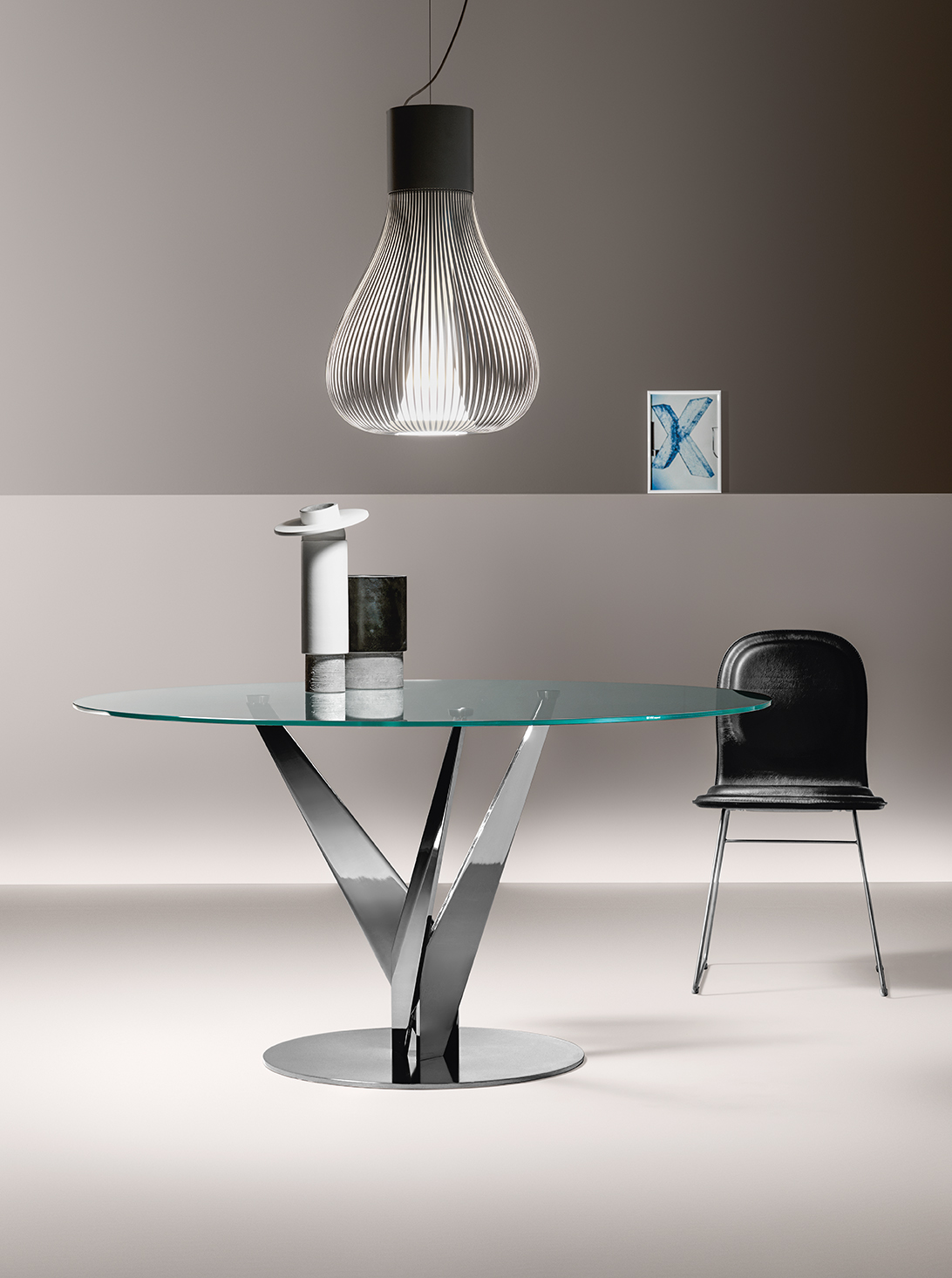 Τραπέζι,σχεδιασμένο από τον Fabio Di Bartolomei, από τη συλλογή της εταιρίας Fiam.Με επιφάνεια από γυαλί πάχους 10 mmδιαφανές,καπνιστό ή μπρονζέ και βάση από ορείχαλκο χρωμιωμένο ή γυαλισμένο .