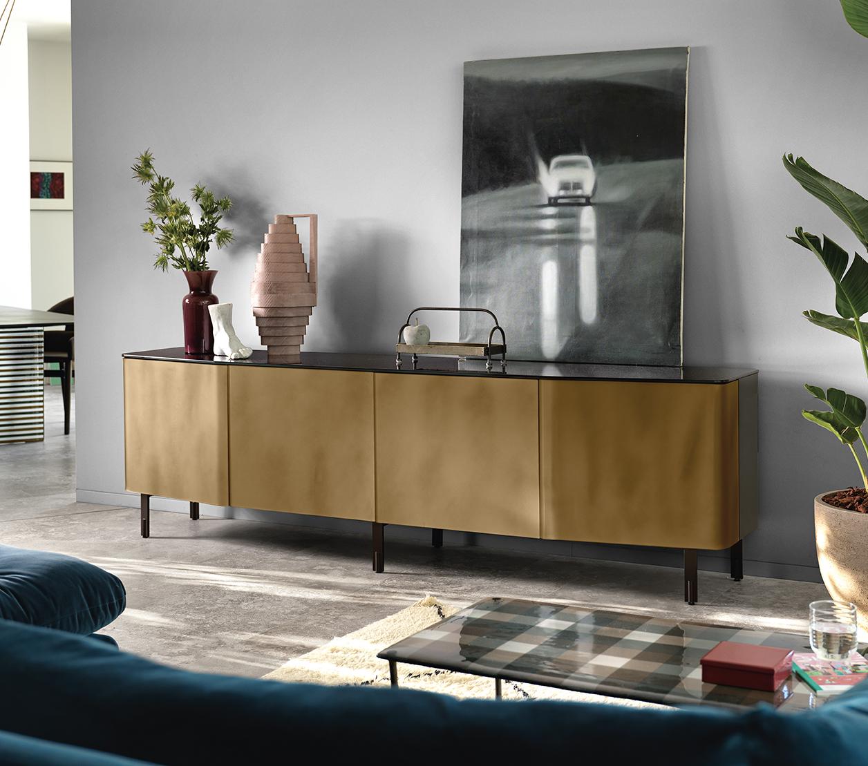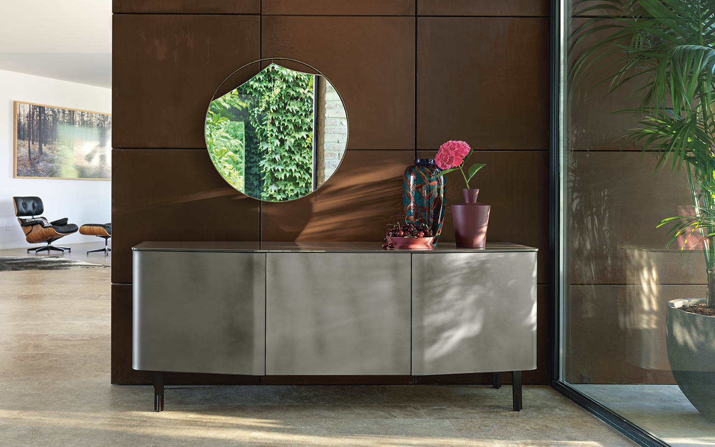 Μπουφές,σχεδιασμένος από Studio Klass,από τη συλλογή της εταιρίας Fiam.Από ξύλο λακαριστό και πόρτες από καμπυλωτό γυαλί χρωματισμένο και κορυφή από λακαριστό γυαλί πάχους 10mm.