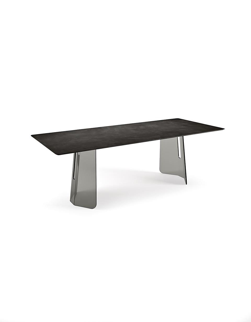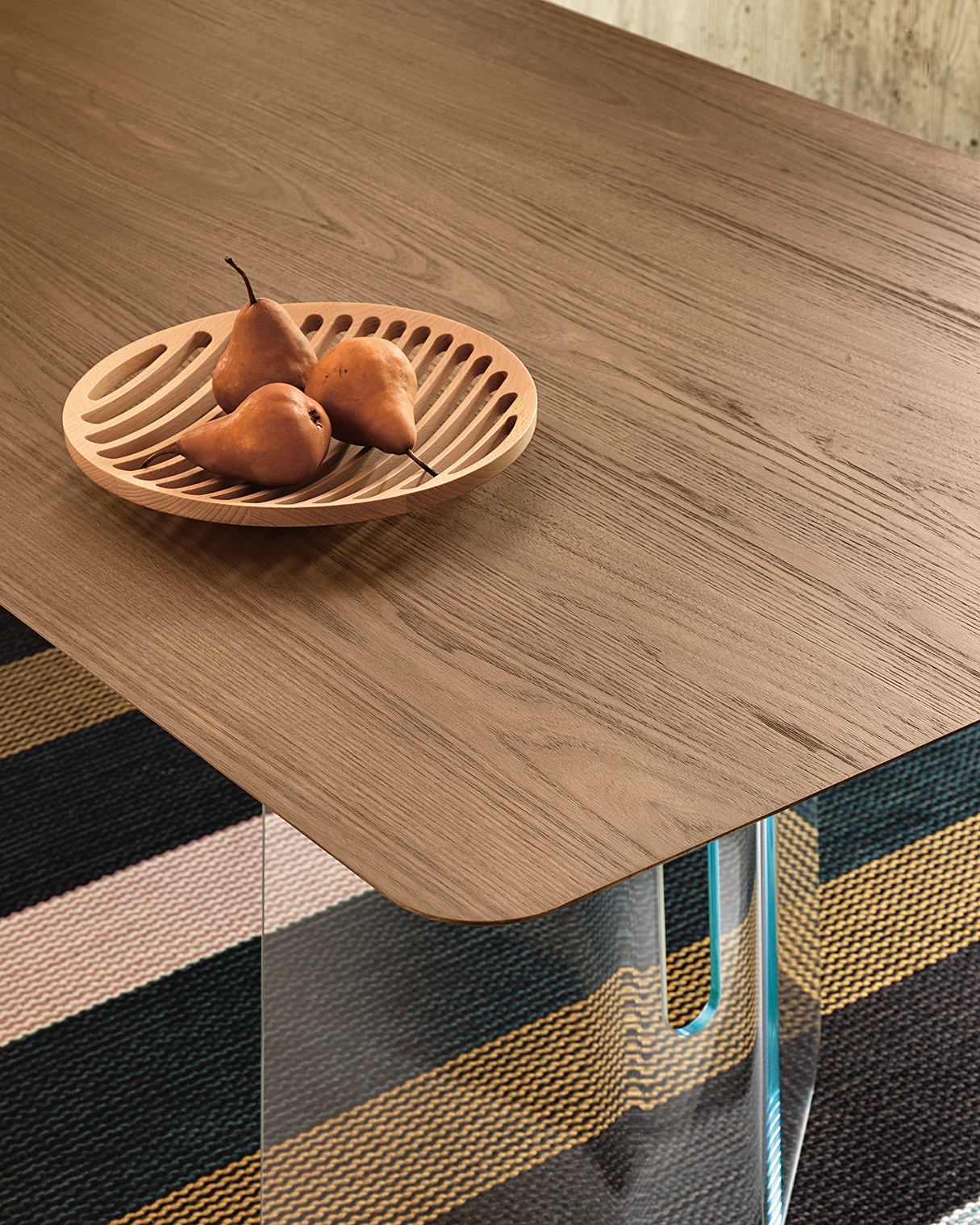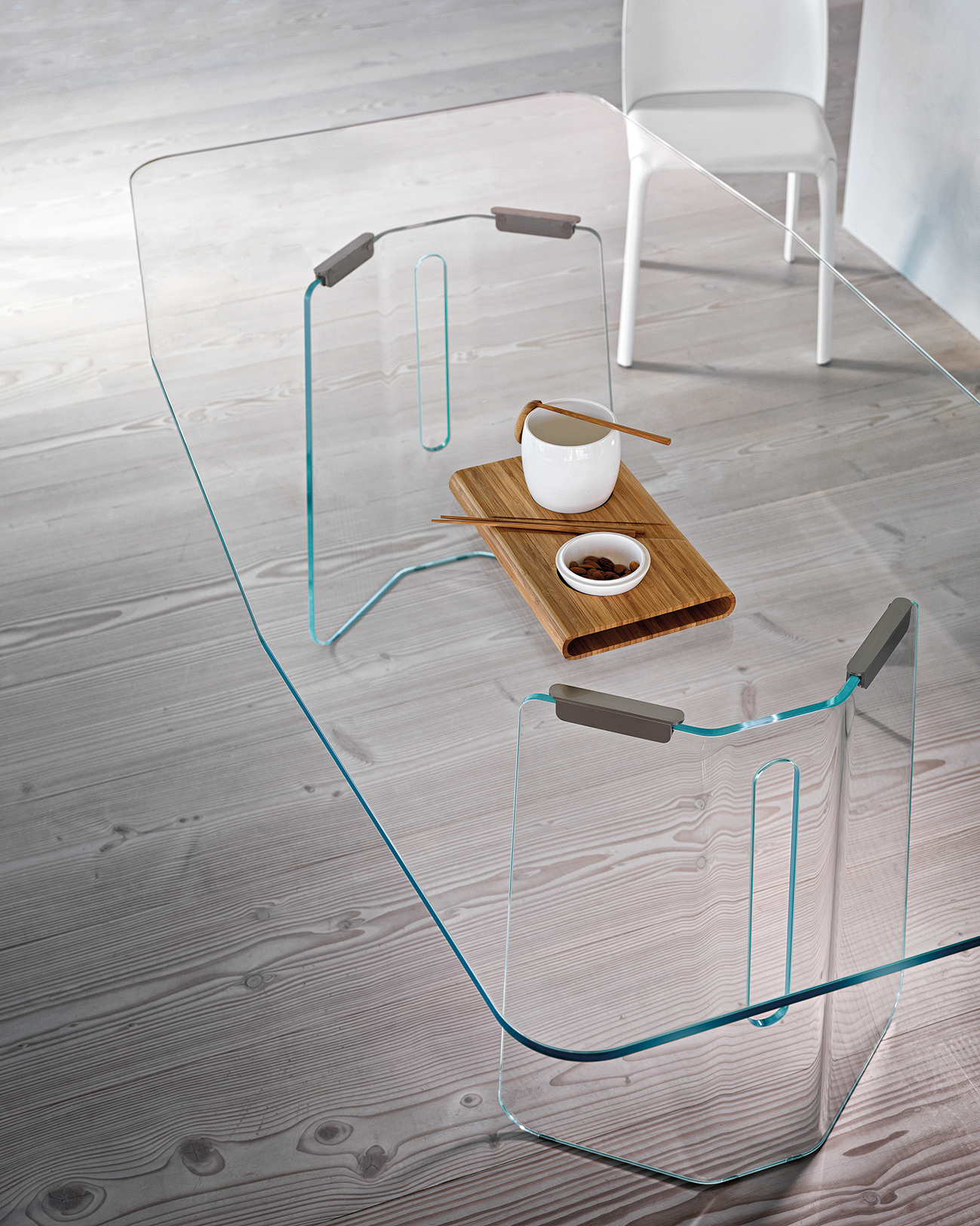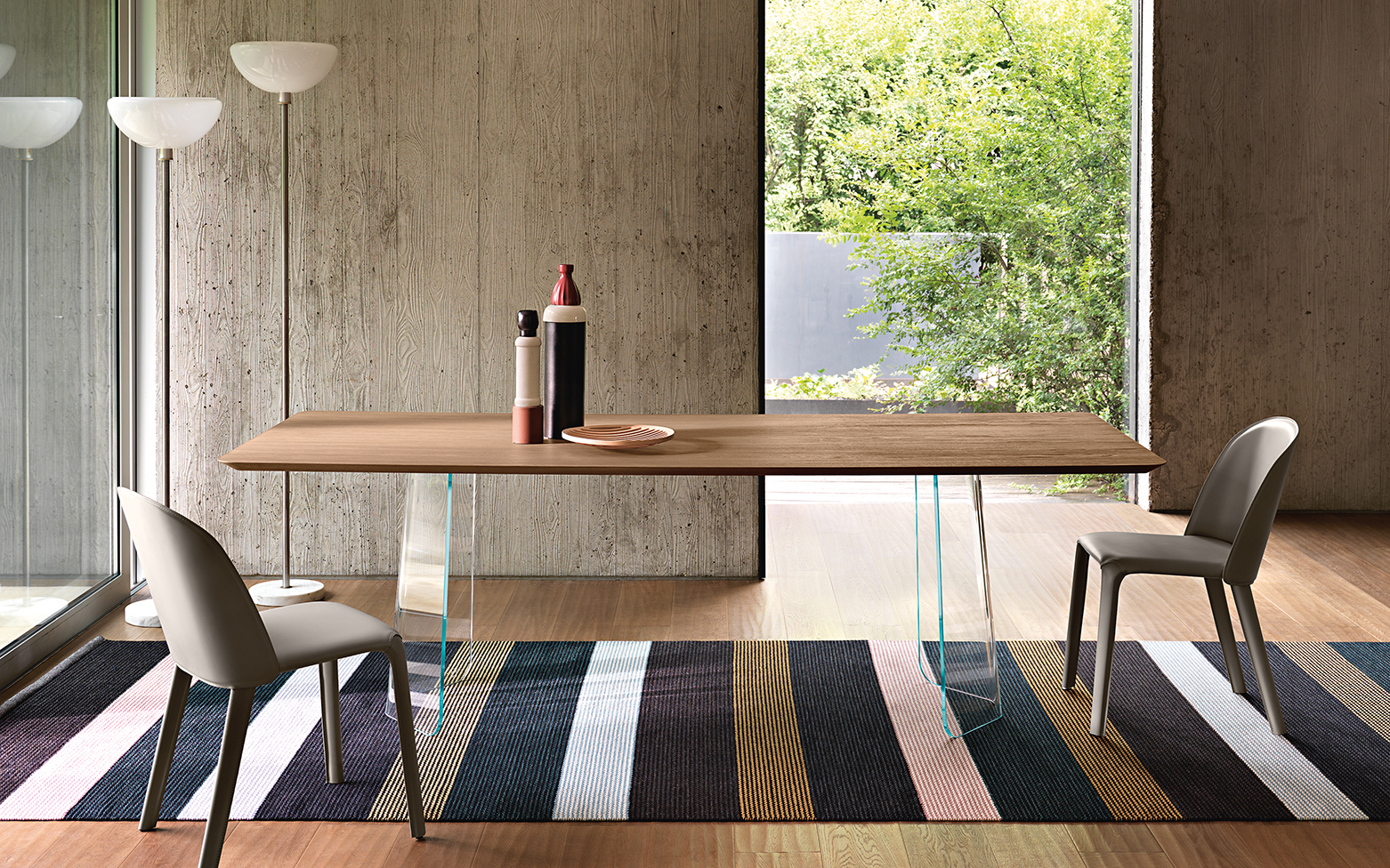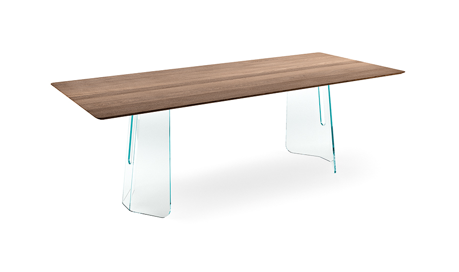 Τραπέζι,σχεδιασμένο από Studio Klass, από τη συλλογή της εταιρίας Fiam.Με βάσεις γυαλί διαφανές ή καπνιστό πάχους και επιφάνεια από γυαλί ή ξύλο, σε καρυδιά, δρύς ή χρωματισμένο.