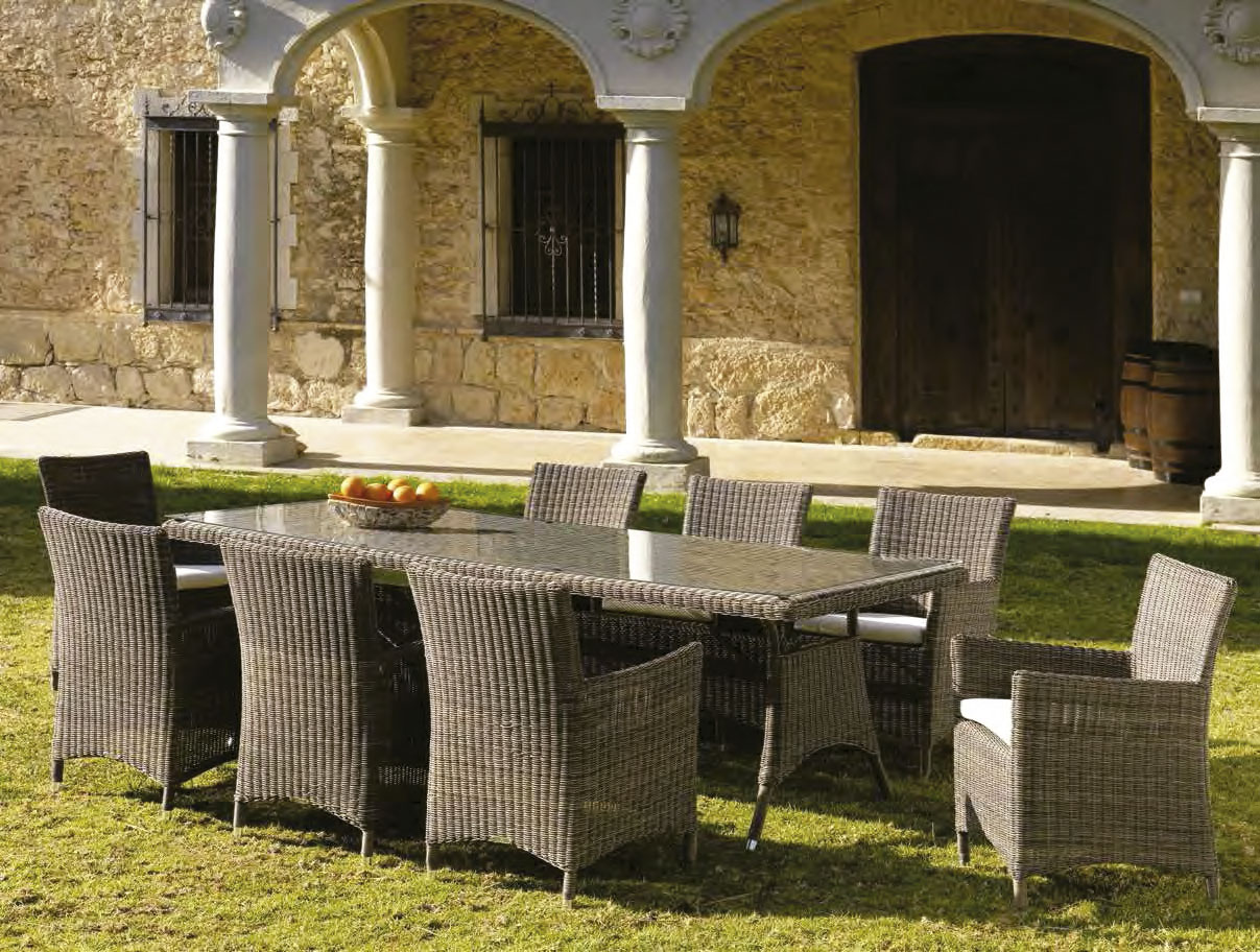 Τραπέζι εξωτερικού χώρου από rattan και καπάκι από γυαλί Διατίθεται σε 3 μεγέθη διαστάσεων: Ø120cm x h76cm 180cm x 100cm x h76cm 240cm x 100cm x h76cm